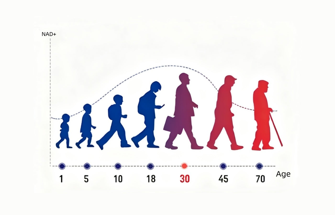 NAD⁺ levels in the body decrease sharply with age, dropping by about 50% every 20 years. By age 40, they are only around 25% of childhood levels. This decline contributes to age-related conditions such as cognitive decline, inflammation, cancer, metabolic disorders, and muscle loss. Supplementing NAD⁺ may help slow or even reverse these processes.