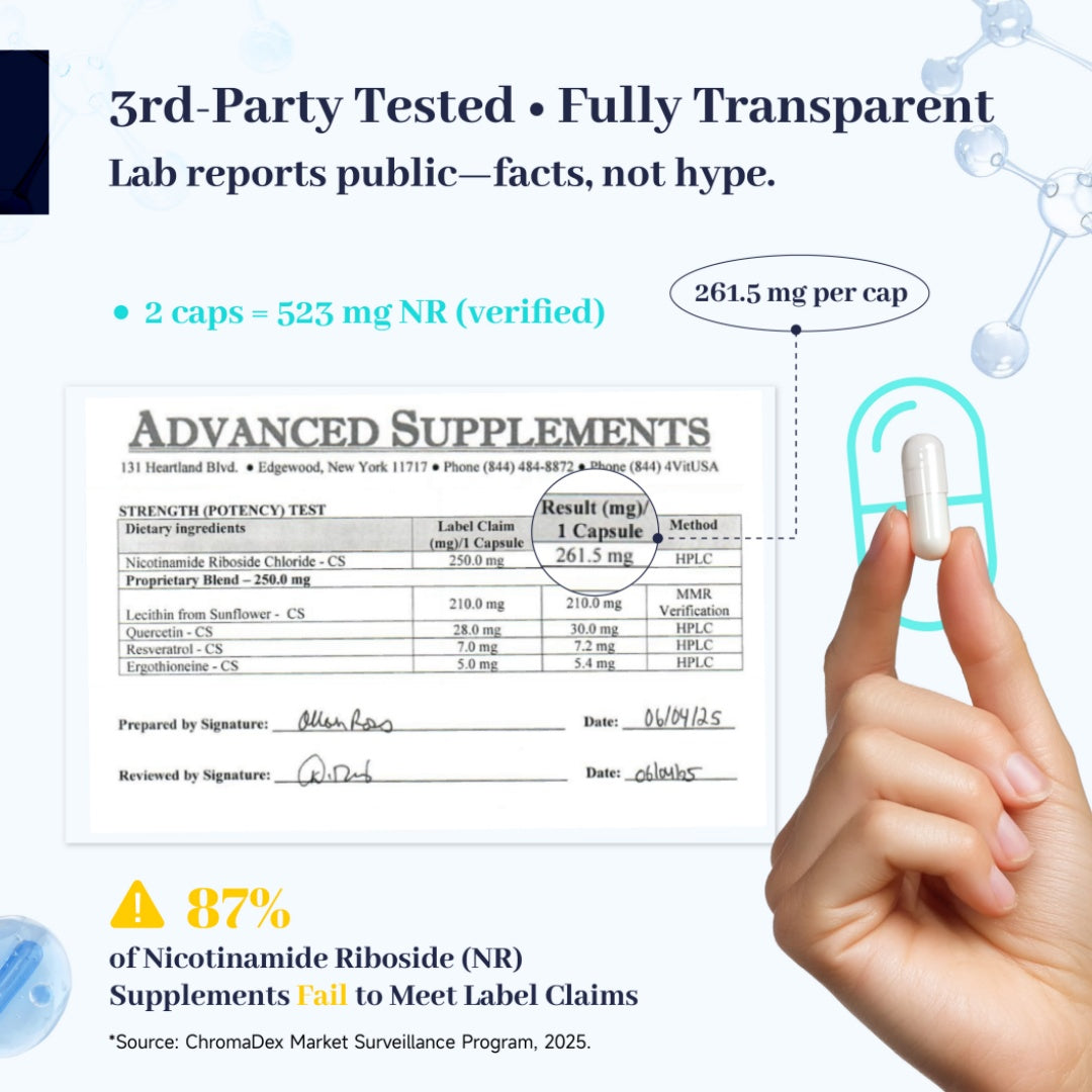 - Nicotinamide Riboside (NR): Clinically proven to increase NAD⁺ levels, thereby supporting cellular metabolism, enhancing DNA repair, and alleviating age-related fatigue.